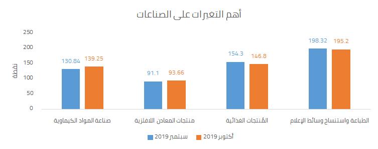 وكان من بين أهم الصناعات التي شهدت ارتفاعًا: صناعة المواد والمُنتجات الكيماوية 139.25 خلال أكتوبر 2019 مُقارنة بشهر سبتمبر 2019 حيث بلغ 130.84 بارتفاع قدره 6.4%، بينما انخفضت المُنتجات الغذائية إلى 146.89 خلال شهر أكتوبر 2019، مُقارنة بشهر سبتمبر 154.3 بنسبة انخفاض قدرها 4.8%، ويوضح الشكل التالي أهم التغيرات على الصناعات المُختلفة: