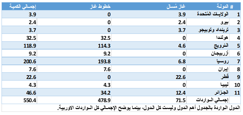 1- يجب أولًا ابراز احتياجات السوق المُستهدفة بتصدير الغاز وهي السوق الأوربية التي استوردت في عام 2018 ما إجماليه 550 مليار قدم مُكعب من الغاز، وتُشكل هذه الحصة نسبة قدرها 34% من جُملة الاستهلاك العالمي من الغاز، بينما استوردت ما إجماليه 519.2 مليون طن من النفط الخام و224.7 مليون طن من المُنتجات النفطية، ويوضح الجدول التالي أهم مُصدري الغاز لأوروبا عن طريق الإسالة أو خطوط الغاز.