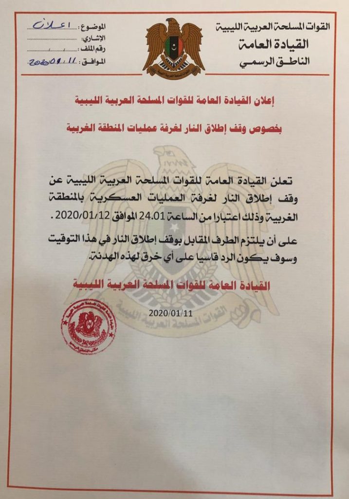 أعلن الجيش الوطني الليبي في بيان مصور ألقاه اللواء “أحمد المسماري” المتحدث باسم قوات الجيش، وقف إطلاق النار لغرفة العمليات العسكرية بالمنطقة الغربية اعتباراً من الساعة 00.01 من 12 يناير 2020، على أن يلتزم الطرف المقابل بوقف إطلاق النار في هذا التوقيت، وتوعد المتحدث باسم الجيش الوطني الليبي بالرد القاسي على أي خرق لهذه الهدنة.