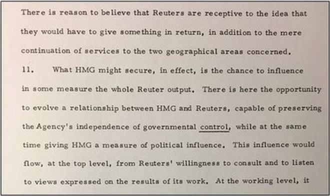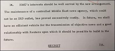 تلك الوثيقة الممهورة بخاتم “سري للغاية” جاء فيها ”يتعين أن يخدم الترتيب الجديد مصالح حكومة صاحبة الجلالة بشكل جيد“. وفي الفترة من 1960 وحتى 1970 لم تكن هناك إشارة واضحة على مدى النجاح الذي حققه التاج البريطاني في سياساته المتحيزة ضد الشرق الأوسط وأمريكا اللاتينية إلا أن الوثيقة تؤكد بما لا يدع مجالًا للشك مدى التدخل الذي كان للحكومة في شؤون رويترز والاتفاق الواضح على إخفاء التمويل.
