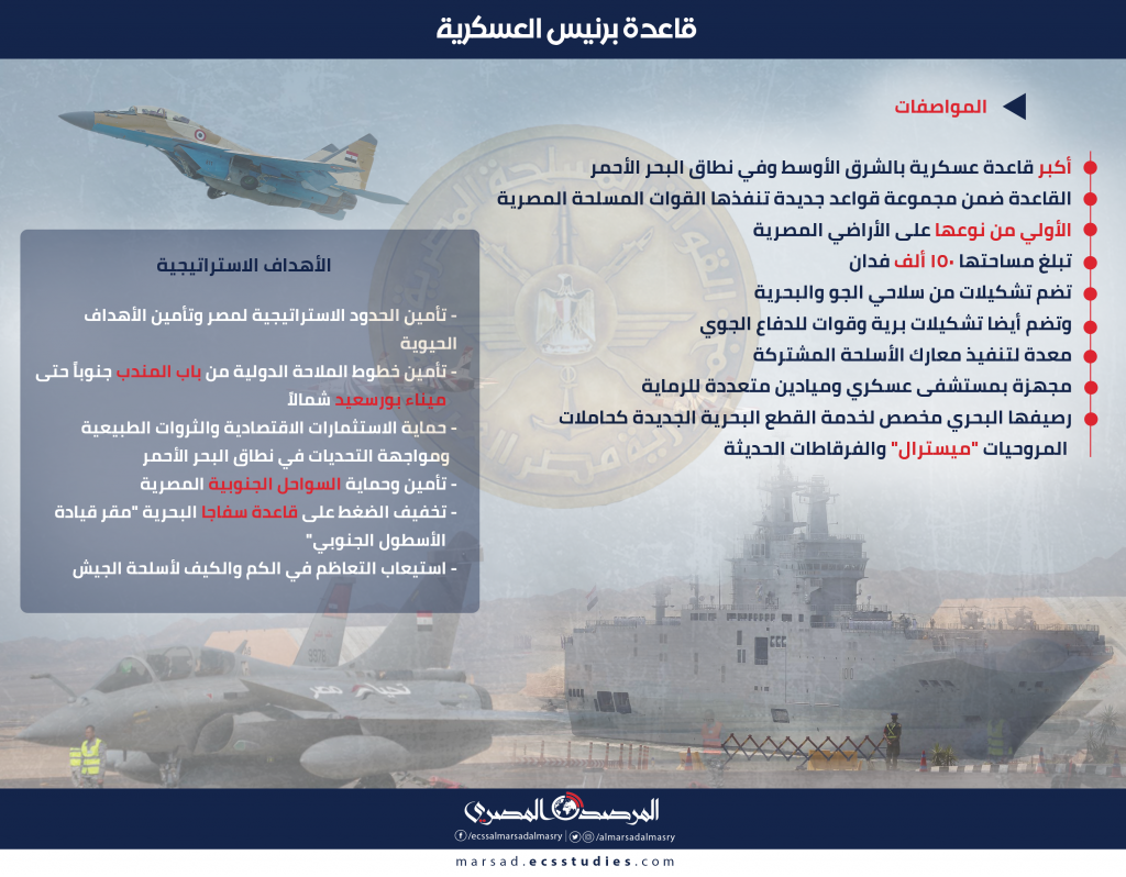 افتتح اليوم الرئيس عبدالفتاح السيسي قاعدة “برنيس العسكرية” في المنطقة الجنوبية، والتي تأتي في إطار خطة مصرية لإنشاء قواعد عسكرية ضخمة لتأمين كافة الاتجاهات الاستراتيجية والأمن القومي المصري. في العرض التالي نستعرض معًا مواصفات هذه القاعدة وأهميتها الاستراتيجية.