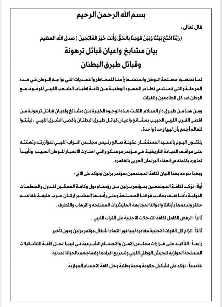 وطالب مجلس مشايخ “ترهونة وطبرق البطنان” خلال البيان القوات الأجنبية بمغادرة ليبيا فور انتهاء أشغال مؤتمر برلين دون تأخير، معلنين تأكديهم على قرارات مجلس الأمن والأجسام الشرعية في ليبيا لحل كافة التشكيلات المسلحة الموازية للجيش الوطني، وتسريح افرادها، وادماجهم بالحياة المدنية.