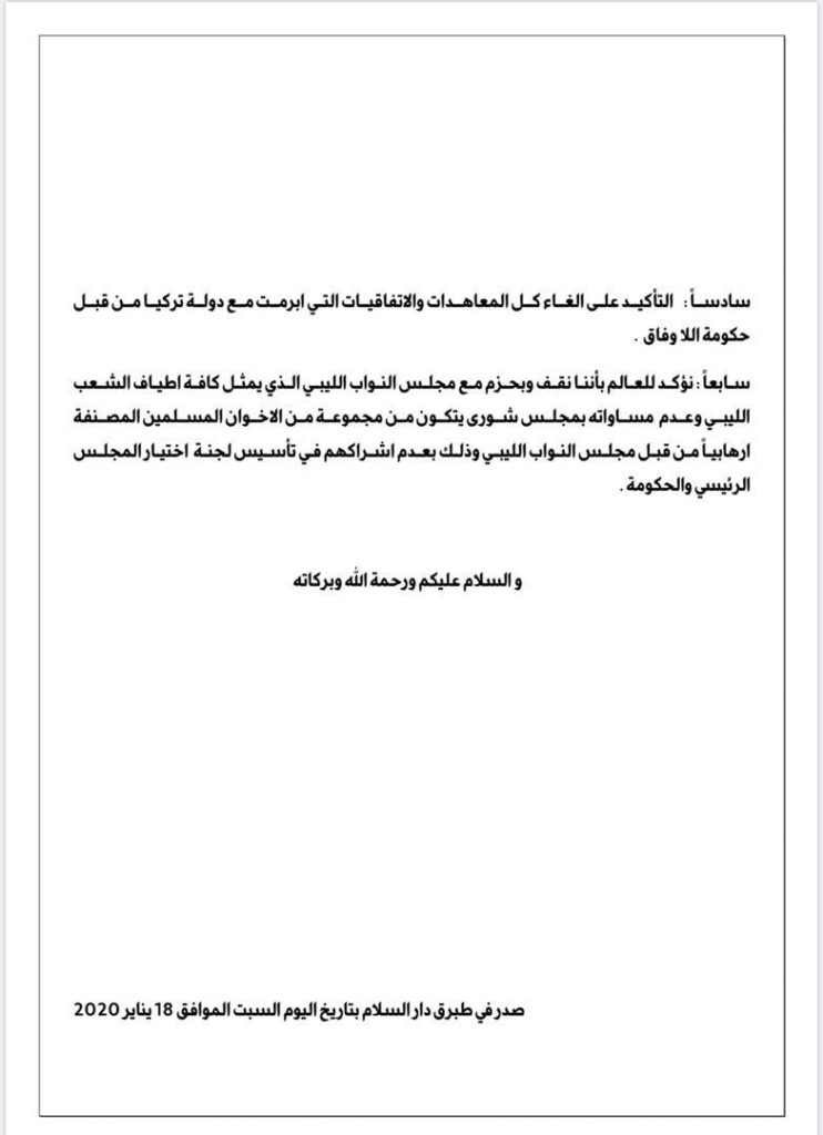 وأكد البيان على تشكيل حكومة وحدة وطنية، وحل كافة الأجسام الموازية، وكذلك الغاء كل المعاهدات والاتفاقيات المبرمة مع تركيا من قبل حكومة الـ “اللا وفاق”.