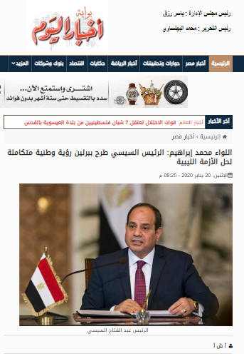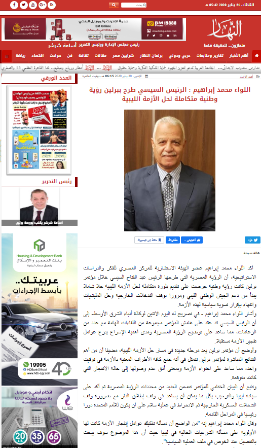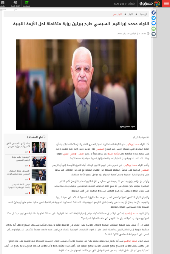 تصريح اللواء/ محمد إبراهيم الدويري عضو الهيئة الاستشارية بالمركز المصري للفكر والدراسات الاستراتيجية لوكالة أنباء الشرق الأوسط حول الرؤية المصرية التى طرحها الرئيس/ عبدالفتاح السيسي خلال مؤتمر برلين.
