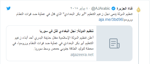 واستقبلت قناة الجزيرة خبر مقتل ابن زعيم داعش، أبو بكر البغدادي، بتأثر واضح، جعل من المتابعين للقناة يعزون الجزيرة بمقتله. وفي عرضها لتقرير نشرته الجزيرة على موقعها الإلكتروني عن مقتل أحد أبناء البغدادي، اسمه حذيفة البدري، بدا واضحًا مدى تأثر القناة والقائمين على السياسة التحريرية فيها بمقتل الرجل. إذ نشرت القناة القطرية جزءًا من النعي الذي أصدره تنظيم داعش على وكالة “أعماق”. فيما كانت لغة الخطاب المستخدمة في التقرير عاطفية، كأن معد التقرير ينعى فيه مدنيًا بريئًا قُتل بحادث إرهابي! وعلى خلاف جميع القنوات الإخبارية العربية والعالمية، نقلت القناة مقتطفات من بيان النعي الذي نشره داعش في وكالة “أعماق”.