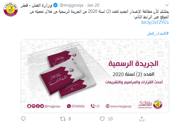 ونشرت وزارة العدل القطرية على صفحتها بموقع التواصل الاجتماعي تويتر بتاريخ 20 يناير التعديلات الموجودة بالجريدة الرسمية في صيغتها النهائية للتعديل والتي تم وصفها بأنها مقيدة بشكل أقل من النسخة المنشورة الأولى، ويمكن الإطلاع على القانون كاملاً هنا.