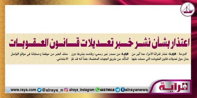 تراجعت صحيفة الراية القطرية، مقدمة اعتذارها عن تقريرها الذي نشرته حول تعديلات قانون العقوبات، والتي قضي بفرض إجراءات مقيدة على حرية التعبير، وذلك عقب ما أثاره القرار من ضجة بين نشطاء على مواقع التواصل الاجتماعي، وذلك من خلال الشريط الإخباري على صفحتها الأولى، كالتالي: “اعتذار بشأن نشر خبر تعديلات قانون العقوبات”، لافتة إلى أن تقريرها استند إلى مصادر غير رسمية، دون التأكّد من الجهات المختصة، مشيرة إلى حذف الخبر من كافة مواقعها.