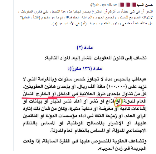 وتساءل أساتذة قانون عما إذا كان هناك أخطاءَ مطبعية في نص المادة، مثلما علق حسن السيد، الذي يُعرف نفسه بأنه أستاذ قانون دستوري في جامعة قطر، نحو شعوره بحدوث خطأ ما، وتوقعه بانه لن يكون المنشور النهائي للمشرع القطري “لانتهاكه الصريح للدستور ولجميع العهود والمواثيق الحقوقية”.