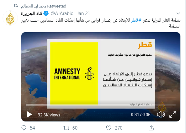 كما تناولت قناة الجزيرة، نقلاً عن منظمة العفو الدولية دعوة قطر نحو الابتعاد عن إصدار القوانين التي من شأنها إسكات النقاد المسالمين.