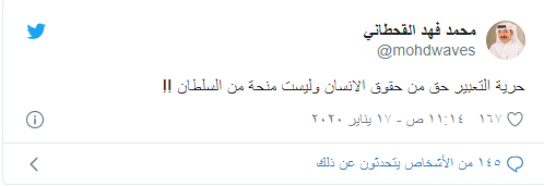 ووصفها محمد فهد القحطاني، الاستشاري القانوني وكاتب عمود رأي قطري، بأن حرية التعبير حق من حقوق الإنسان، وليس منحة من السلطان.