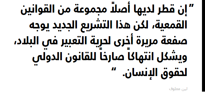 كما قالت قالت مديرة البحوث ببرنامج الشرق الأوسط في المنظمة لين معلوف، إن “قطر لديها بالفعل مجموعة من القوانين القمعية، لكن هذا التشريع الجديد يوجه ضربة مريرة أخرى لحرية التعبير في البلاد ويعد انتهاكا صارخا لقانون حقوق الإنسان الدولي”.، وأضافت: “من المقلق للغاية أن يوافق أمير قطر الشيخ تميم بن حمد آل ثاني على تشريع يمكن أن يستخدم لإسكات المنتقدين السلميين”، وطالبت السلطات القطرية بإلغاء هذه القوانين بما يتماشى مع إلتزاماتها القانونية الدولية.