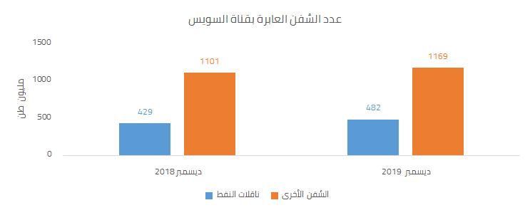 أعلن الجهاز المركزي للتعبئة العامة والإحصاء في نشرته المعلوماتية الشهرية عن ارتفاع أعداد السُفن العابرة بقناة السويس إلى 482 ناقلة نفط في ديسمبر 2019 بعدما كانت قد بلغت 429 في ديسمبر 2018، كذلك ارتفعت أعداد السُفن الأخرى بخلاف ناقلات النفط إلى 1169 في ذات الشهر مُقارنة بالحال في ديسمبر 2018 عندما وصل العدد إلى 1101، كما نحو ما يوضحه الشكل التالي: