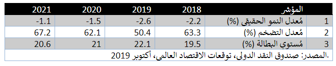 ويتوقع صندوق النقد الدولي استمرار التضخم عند مُعدلات عند 50.4% خلال عام 2019، ثم اتجاهه إلى ارتفاع لأعلى من 62.1% حتى يصل مُعدلات 67.6% عند عام 2022، وهو ما يضع مزيدًا من الضغوط على كاهل الحكومة الحالية التي ستواجه مُعدلات تضخم مُرتفعة في ظل مُعدلات بطالة مُتدنية واقتصاد في حالة انكماش، يوضح الجدول التالي تطور مُعدلات المؤشرات الثلاثة السابقة خلال الفترة من 2018 وحتى 2021: