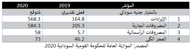 استهدفت الحكومة الانتقالية عند تقديمها موازنة 2020، تحقيق أهداف الثورة وذلك بزيادة الإنفاق الاجتماعي، وكان من أهم مظاهر ذلك رفع مُخصصات الصحة والتعليم لضعف ما كانت عليه في 2019، الالتزام بمجانية التعليم الأساسي، الالتزام بمجانية العلاج بالطوارئ والمُستشفيات الحكومية، مُضاعفة بند الأجور، رفع الحد الأدنى للأجور إلى أكثر من الضعف. وتستهدف الحكومة تحقيق ذلك عبر رفع مُضاعفة الإنفاق الحكومي الجاري بأكثر من 280% عما كان عليه في 2018 وذلك برفعه من 205.3 مليار جنيه سوداني إلى 584.3 مليارًا، وتغطية ذلك برفع الإيرادات عن العام السابق بنسبة 340% تقريبًا، من مستوى 164.8 مليار جنيه سوداني إلى 568.3، وهي أرقام صعب للغاية تحقيقها حتى في ظل نسب التضخم المُرتفعة التي تضرب الاقتصاد السوداني في الوقت، ويوضح الجدول التالي الصورة الكُلية لموازنة عام 2020 مُقارنة بـ2019: