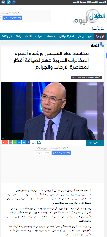 تصريح لموقع الهلال اليوم “لقاء السيسي ورؤساء أجهزة المخابرات العربية مهم لصياغة أفكار لمحاصرة الإرهاب والجرائم”