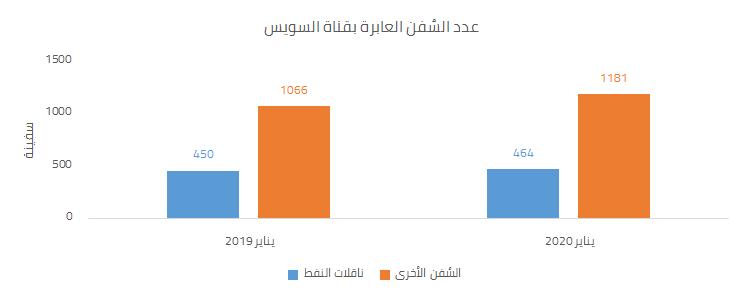أعلن الجهاز المركزي للتعبئة العامة والإحصاء في نشرته المعلوماتية الشهرية ارتفاع أعداد السُفن العابرة بقناة السويس إلى 464 ناقلة نفط في يناير 2019 بعدما كانت قد بلغت 450 في يناير2019، كذلك ارتفعت أعداد السُفن الأخرى بخلاف ناقلات النفط إلى 1181 في ذات الشهر مُقارنة بالحال في يناير2020 عندما وصل العدد إلى 1066، على نحو ما يوضحه الشكل التالي: