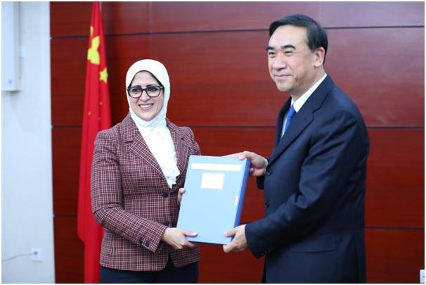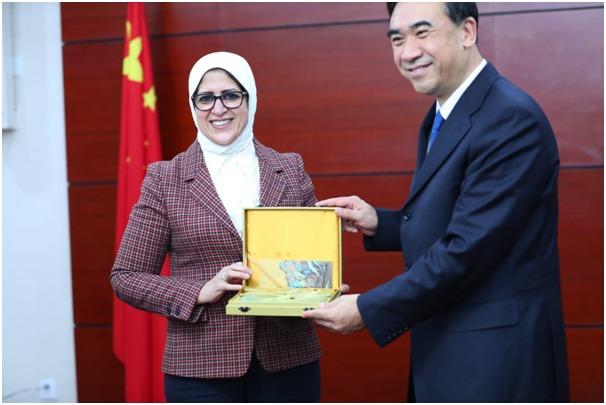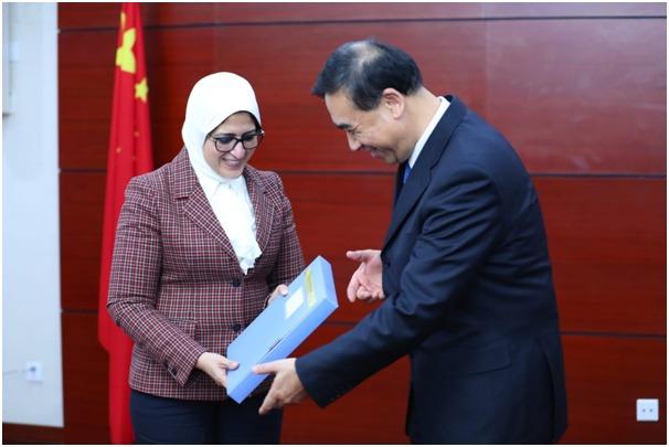 وسلم القائم بأعمال وزير الصحة الصيني الدكتورة هالة زايد الوثائق الفنية المشتركة لكل من منظمة الصحة العالمية ووزارة الصحة الصينية عن سياسات مكافحة كورونا بالإضافة إلى هدية تذكارية.