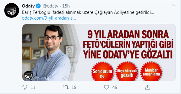 استمرارا لمسلسل تقييد الحريات التي تنتهجه تركيا، أصدرت السلطات التركية أمر اعتقال لمدير موقع أخبار “أودا تي في OdaTv” باريش ترك أوغلو، بسبب نشره تقرير عن تشييع جنازة أحد أفراد جهاز المخابرات التركية والذي قٌتل في ليبيا.