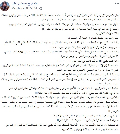 في نفس السياق، كتب قائد ما يسمى بسلاح المدفعية في ميليشيات الوفاق، العقيد فرج اخليل، على صفحته بموقع (فيسبوك)، بعض التفاصيل حول المشهد الميليشياوي الحالي في طرابلس. تحدث أخليل عن أن ميليشيات العاصمة تضع على مقراتها لافتات تفيد بمنع تواجد أو دخول أية قوات نظامية سواء كانت تابعة لوزارة داخلية الوفاق أو رئاسة الأركان، وفي حالة مخالفة ذلك يتم اعتقال المخالفين، ومصادرة سياراتهم الحكومية. أما اذا كان المخالف لهذه التعليمات منتمياً إلى ميليشيا قوية أخرى، فأن ذلك يكون بمثابة حصانة له، ولو كانت الميليشيا التي ينتمي أليها ضعيفة، يكون مصيره هو نفس مصير المنتمين للشرطة أو الجيش.