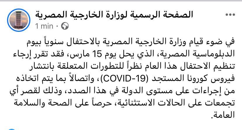 أرجأت وزارة الخارجية الاحتفال السنوي بيوم الدبلوماسية المصرية الذي كان مقررا له غدا الأحد حرصا على الصحة والسلامة العامة وما يتخذ من إجراءات لمواجهة انتشار فيروس كورونا.