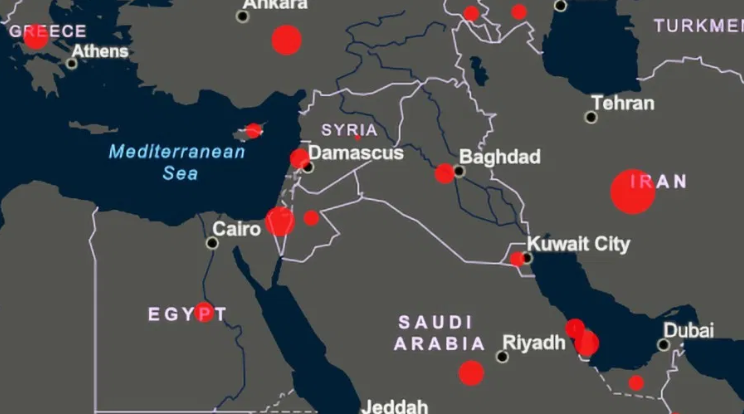 ذكر مركز القدس للشؤون العامة الإسرائيلي أن وباء كورونا العالمي يشل حركة العالم كله مع معظم دول الشرق الأوسط. باستثناء إيران، برغم أن عدد المصابين والقتلى بها مرتفع.