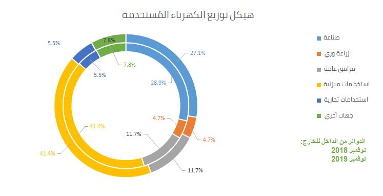 أعلن الجهاز المركزي للتعبئة العامة والإحصاء في نشرته الشهرية المعلوماتية عن تحول في هيكل توزيع الكهرباء المُستخدمة على مُستوى القطاعات الاقتصادية في نوفمبر 2019، ففيما ارتفع الاستهلاك المنزلي إلى مستوى 5.5 ميجا وات/ساعة بنسبة 42.6% من جُملة الاستهلاك، انخفض الاستهلاك الصناعي إلى 3.5 ميجا وات/ساعة بنسبة 27.1 % من جُملة الاستخدام، بعدما كان قد بلغ 3.7 ميجا وات/ساعة وبنسبة 28.9% من جُملة الاستخدام، يوضح الشكل التالي هذه التغيرات: