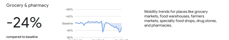 حركة تنقل وتردد المصريين على محال البقالة والصيدليات، تأثرت في نفس هذه الفترة بنسبة إجمالية تبلغ 24 بالمائة فقط، وهذا بالطبع يعود إلى طبيعة هذه الأماكن، التي لا غني عنها، وهي من ضمن الأماكن التي تم استثنائها من قرارات إغلاق المحال التجارية والخدمية.