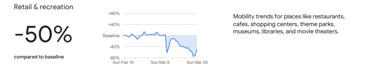 في ما يتعلق بمستوى حركة وتنقل المصريين في المناطق الترفيهية ومحال التجزئة، رصدت مؤسسة جوجل، تأثرها بنسبة تبلغ 50 بالمائة، مقارنة بمستواها في المراحل السابقة ليوم الثامن من مارس، الذي شهد الإعلان عن حالة الوفاة الأولى من جراء فيروس كورونا على الأراضي المصرية، واستمر الانخفاض التدريجي في مستوى حركة وتنقل المصريين في هذه المناطق، التي تشمل المولات التجارية والحدائق العامة والمقاهي والمطاعم والمتاحف والمكتبات ودور السينما والمسرح، خاصة بعد تطبيق حظر التجوال الليلي في الخامس والعشرين من الشهر الماضي.