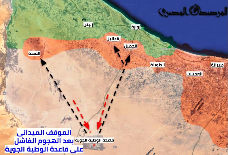 يضاف إلى هذا أن غطاء الحماية الذي تحصلت عليه قاعدة الوطية، بعد سيطرة الجيش الوطني في وقت سابق على العسة والجميل والعجيلات ورقدالين، قد انتهى الآن فعلياً، وبالتالي باتت الحاجة ماسة لتعزيز القوات المتواجدة داخل القاعدة، وكذا حماية طريق إمدادها الوحيد، الذي يقع جنوبها.