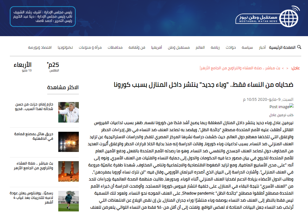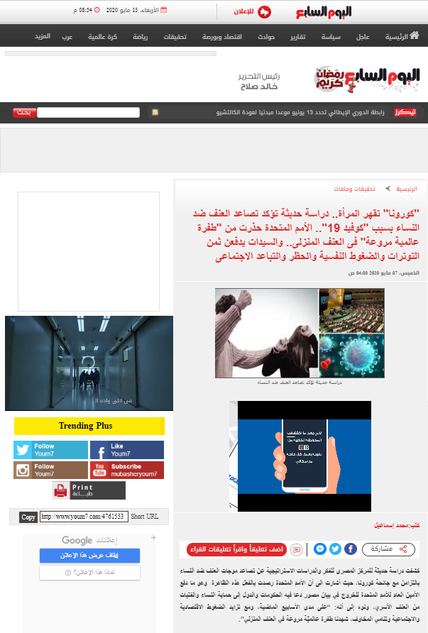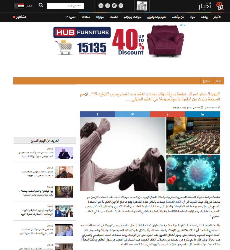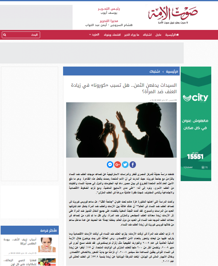 “جائحة الظل: هل ساهم فيروس كورونا في تصاعد العنف ضد النساء في العالم ؟” د. عزة هاشم نشر بوحدة قضايا المرأة والأسرة بالموقع الالكتروني للمركز المصري بتاريخ 3 مايو 2020