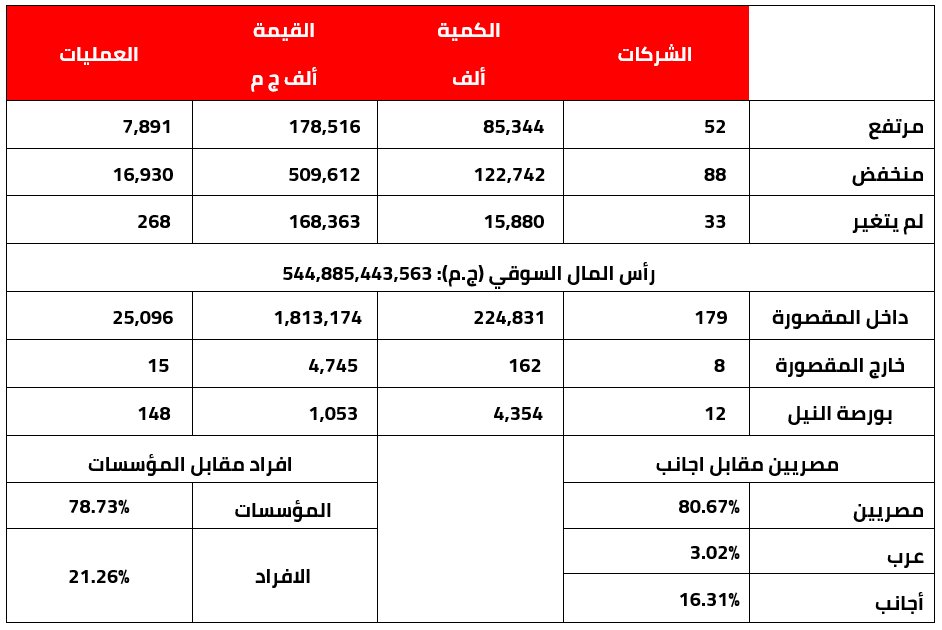افتتح سوق الأوراق المالية المصري تعاملاته ليوم 14 مايو عند مستوى 10385 نقطة وأغلق المؤشر عند مستوى 10287، وحقق انخفاضا بمقدار 109 نقاط أي ما يمثل 1.05%، بلغت أحجام التداول عدد 228 ألف سهم بقيمة 857 مليون جم، استحوذت المؤسسات على نسبة 79%، وبلغت نسبة الأفراد 21%، وقد مثلت تعاملات المصريين 81% ومثل الأجانب نسبة 16% أما تعاملات العرب فقد مثلت نسبة 3% من إجمالي التعاملات.
