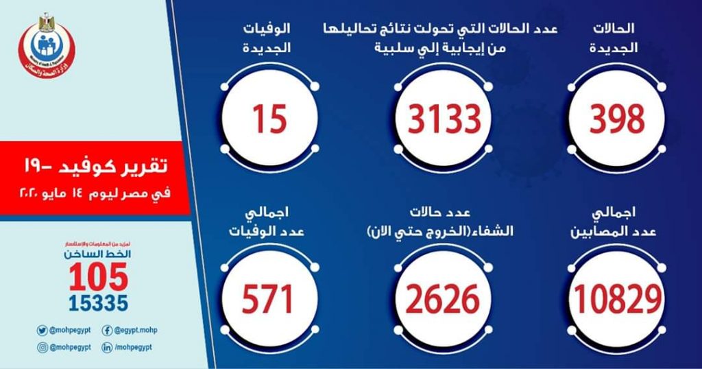 وذكر “مجاهد” أن إجمالي العدد الذي تم تسجيله في مصر بفيروس كورونا المستجد حتى اليوم الخميس، هو 10829 حالة من ضمنهم 2626 حالة تم شفاؤها وخرجت من مستشفيات العزل والحجر الصحي، و 571 حالة وفاة.