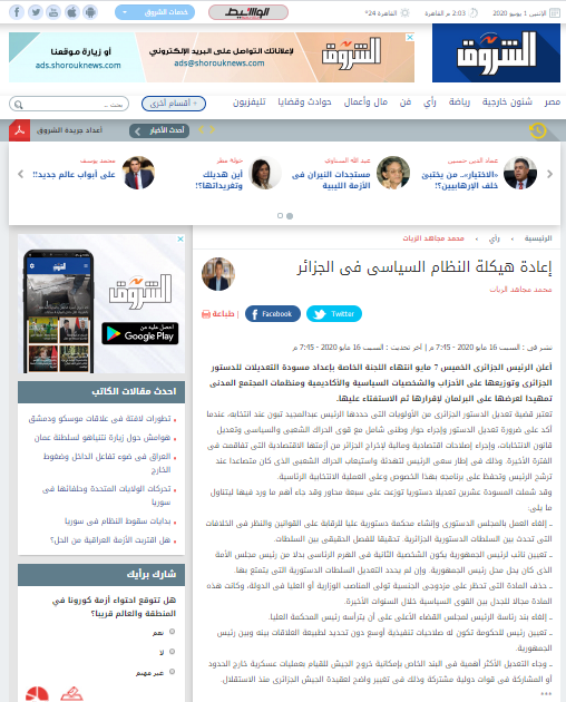 الشروق | “إعادة هيكلة النظام السياسى فى الجزائر” 16 مايو
