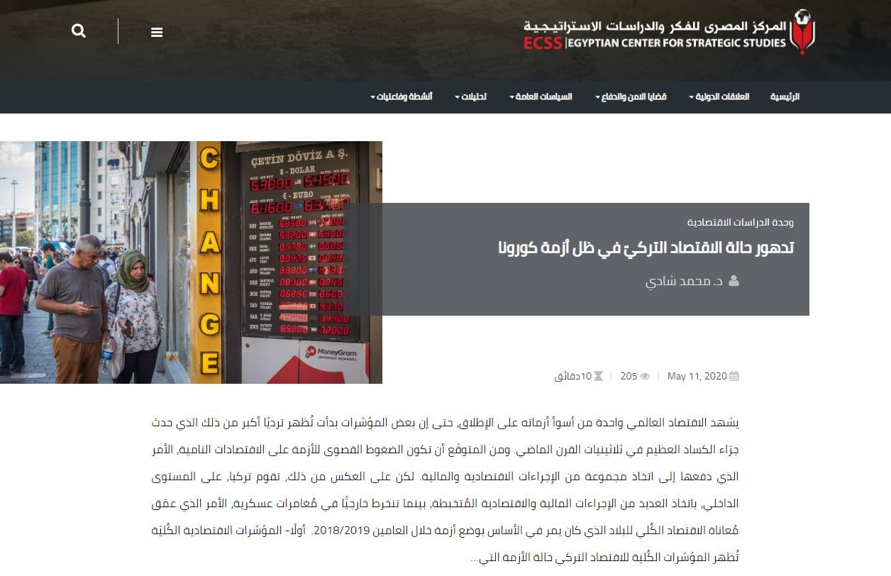 “تدهور حالة الاقتصاد التركيّ في ظل أزمة كورونا” د. محمد شادي نشر بالموقع الإلكترونى للمركز بتاريخ 11 مايو 2020
