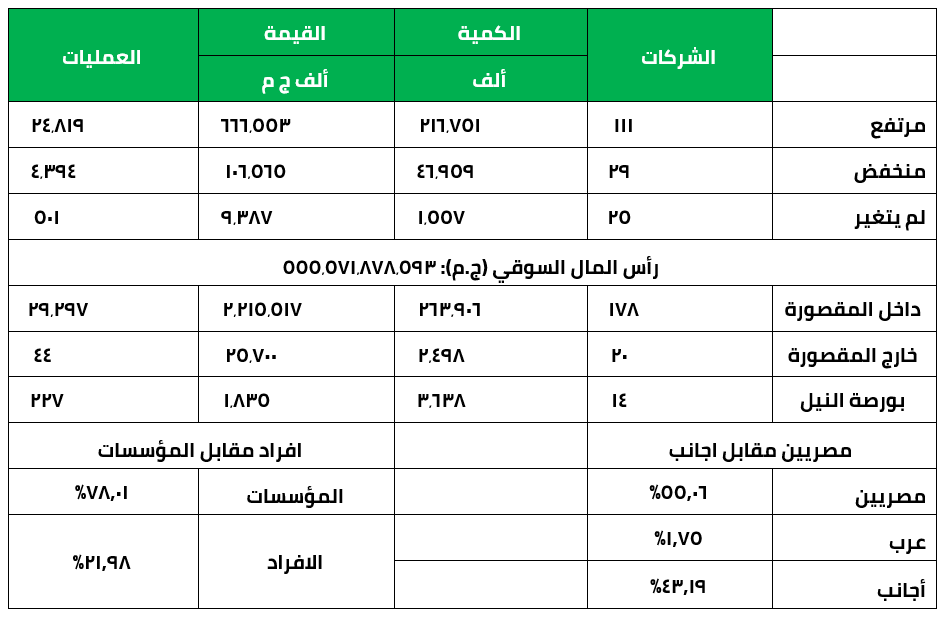 افتتح سوق الأوراق المالية المصري تعاملاته ليوم 2 يونيو عند مستوى 10229 نقطة وأغلق المؤشر عند مستوى 10338، وحقق ارتفاعا بمقدار 111 نقاط أي ما يمثل 1.09%، بلغت أحجام التداول عدد 275 ألف سهم بقيمة 820 مليون جم، استحوذت المؤسسات على نسبة 78%، وبلغت نسبة الأفراد 22%، وقد مثلت تعاملات المصريين 55% ومثل الأجانب نسبة 43% أما تعاملات العرب فقد مثلت نسبة 1.7% من إجمالي التعاملات.