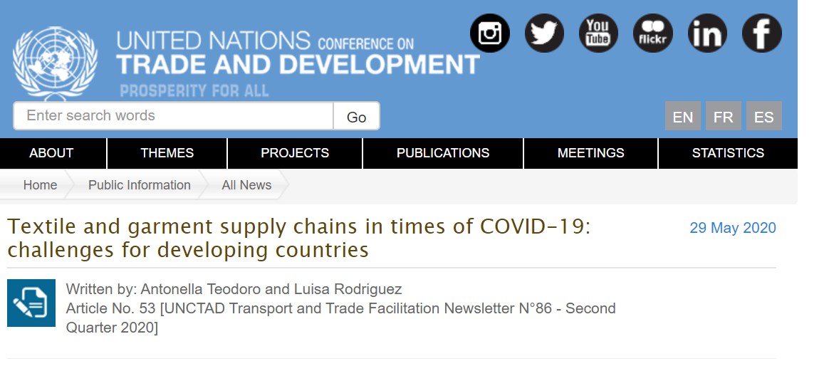 أصدر مؤتمر الأمم المتحدة للتجارة والتنمية (الأونكتاد) تقريرًا يوم الثامن والعشرين من مايو الماضي بواسطة الكاتبين “أنتونيلا تيودورو” و”لويزا رودريجيز” بشأن تداعيات فيروس كورونا على صناعة الملابس والأزياء حول العالم وخاصة في الدول النامية التي تعتمد على هذه الصناعة في نسبة كبيرة من صادراتها وناتجها المحلي الإجمالي.