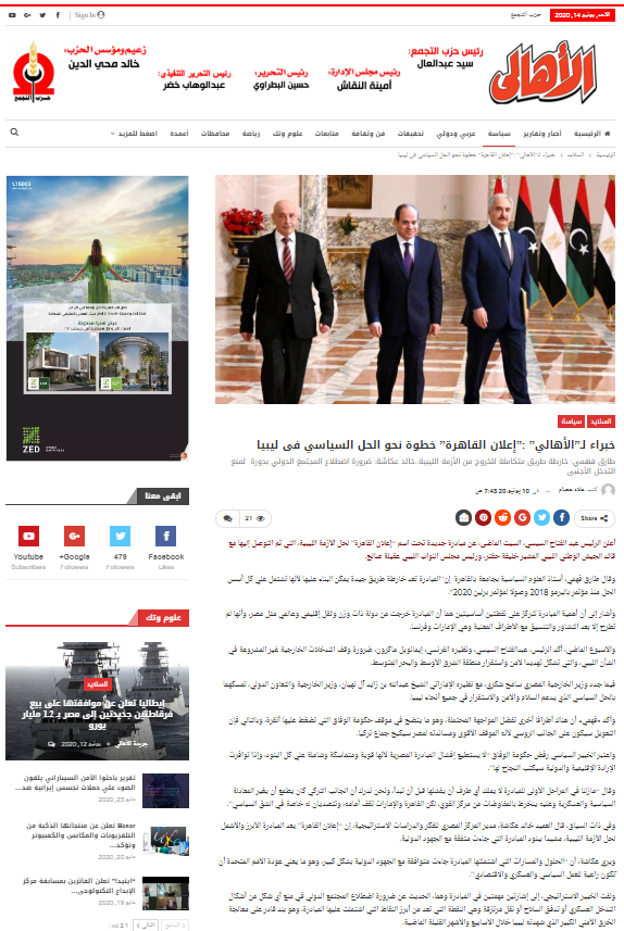 تصريح د. خالد عكاشة المدير العام لجريدة الأهالى “خبراء لـ”الأهالي” :”إعلان القاهرة” خطوة نحو الحل السياسي فى ليبيا”