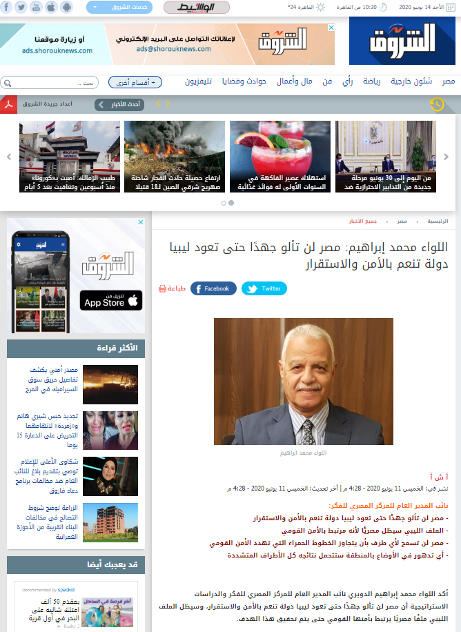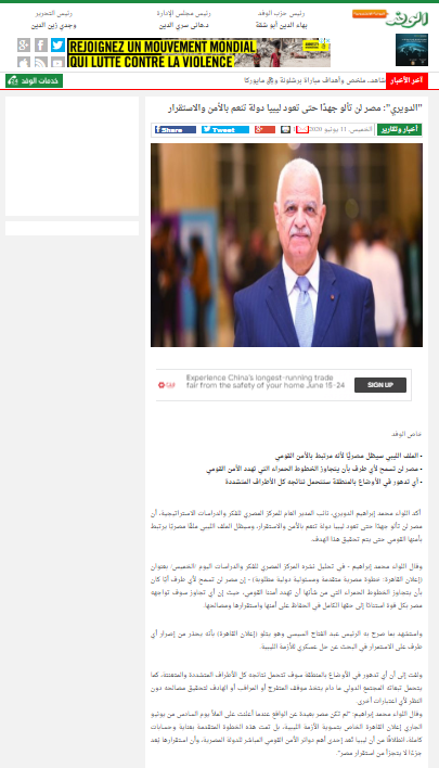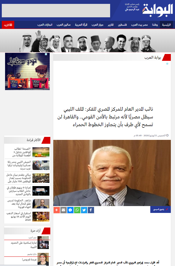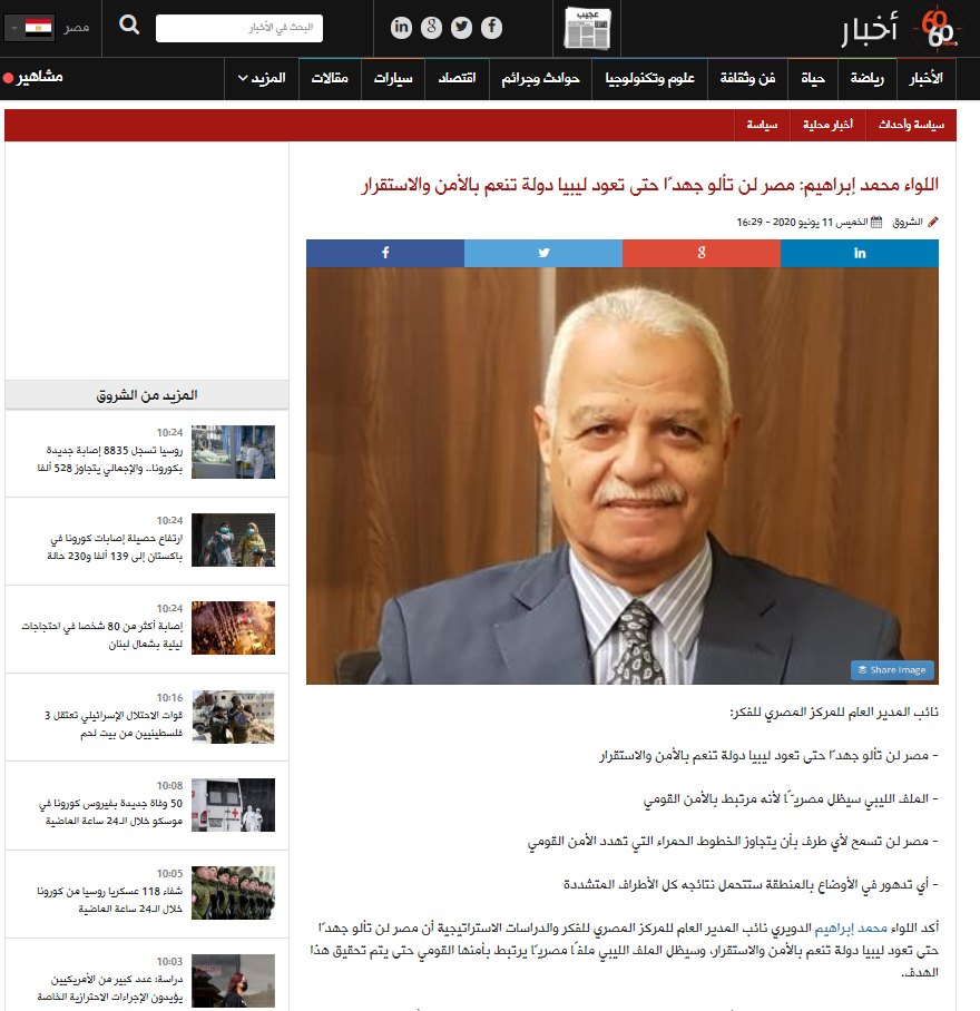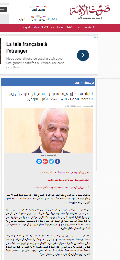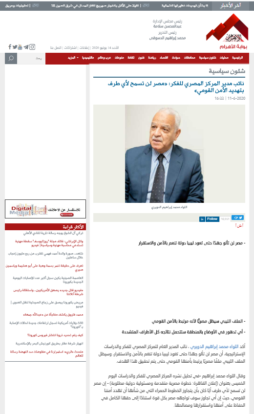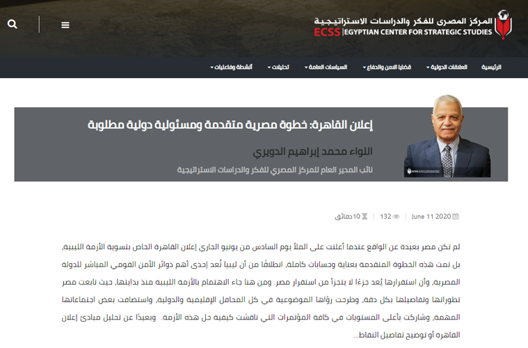 مقال رأي “إعلان القاهرة: خطوة مصرية متقدمة ومسئولية دولية مطلوبة” لــ اللواء/ محمد إبراهيم الدويري نائب المدير العام نشر بالموقع الإلكتروني للمركز بتاريخ 11 يونيو 2020.