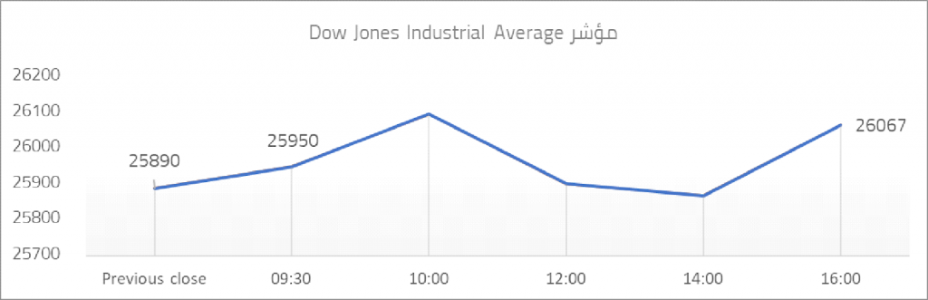 افتتح مؤشر داون جونز “مؤشر يضم أكبر ثلاثين شركة صناعية أمريكية” تعاملاته ليوم 08 يوليو عند مستوى 25950 وأغلق عند مستوى 26067 وحقق ارتفاعا بمقدار 177 نقطة أي ما يساوي 0.68%، وتعتبر منطقة الدعم الحالية مستوى 22400-22600، أما مستوى المقاومة فيمثل 26500 الذي باختراقه يتجه المؤشر صوب مستوى 27200 -27500.