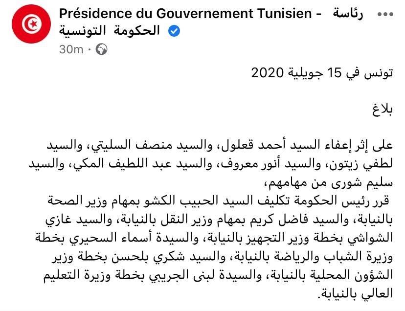 وقبل تقديم الفخفاخ استقالته أمس الإربعاء إلى رئيس الجمهورية قيس سعيد، اتخذ رئيس الحكومة المستقيل قرارًا بإعفاء وزراء النهضة من الحكومة، وهم أحمد قعلول ومنصف السليتي ولطفي زيتون وأنور معروف وعبد اللطيف المكي وسليم شورى من مهامهم، وتكليف الحبيب الكشو بمهام وزير الصحة بالنيابة، وفاضل كريم بمهام وزير النقل بالنيابة، وغازي الشواشي بخطة وزير التجهيز بالنيابة، وأسماء السحيري بخطة وزيرة الشباب والرياضة بالنيابة، وشكري بلحسن بخطة وزير الشؤون المحلية بالنيابة، ولبنى الجريبي بخطة وزيرة التعليم العالي بالنيابة .