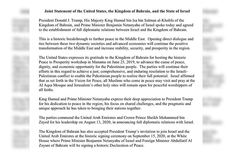 بيان ثلاثي أمريكي إسرائيلي بحريني لإعلان اتفاقية تطبيع العلاقات بين البحرين وإسرائيل