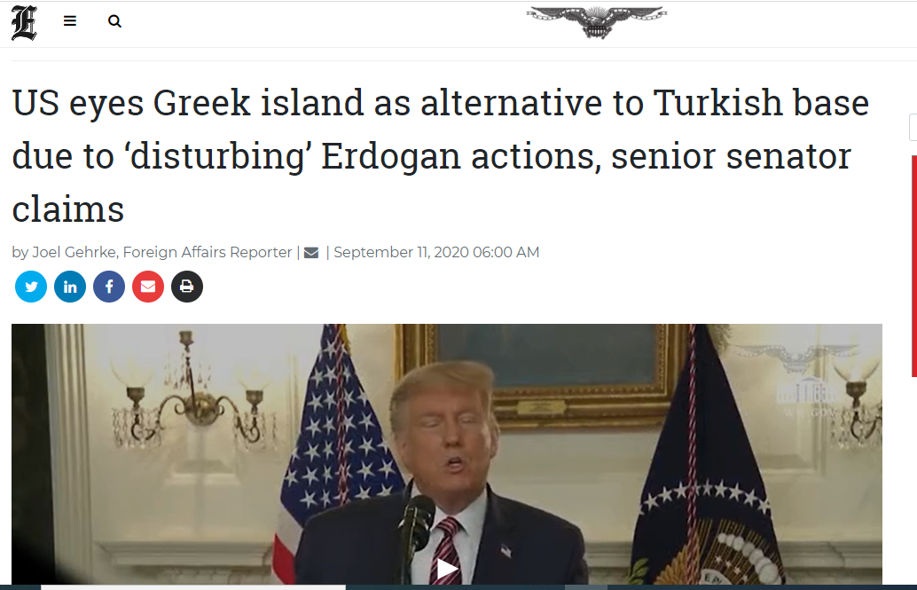 نشرت صحيفة واشنطن إيكزامينير الأمريكية تقريرًا، تحت عنوان “الولايات المتحدة الأمريكية تنظر إلى جزيرة اليونان باعتبارها بديلا مُحتملا عن القاعدة التركية.. بفعل تصرفات أردوغان المقلقة “.
