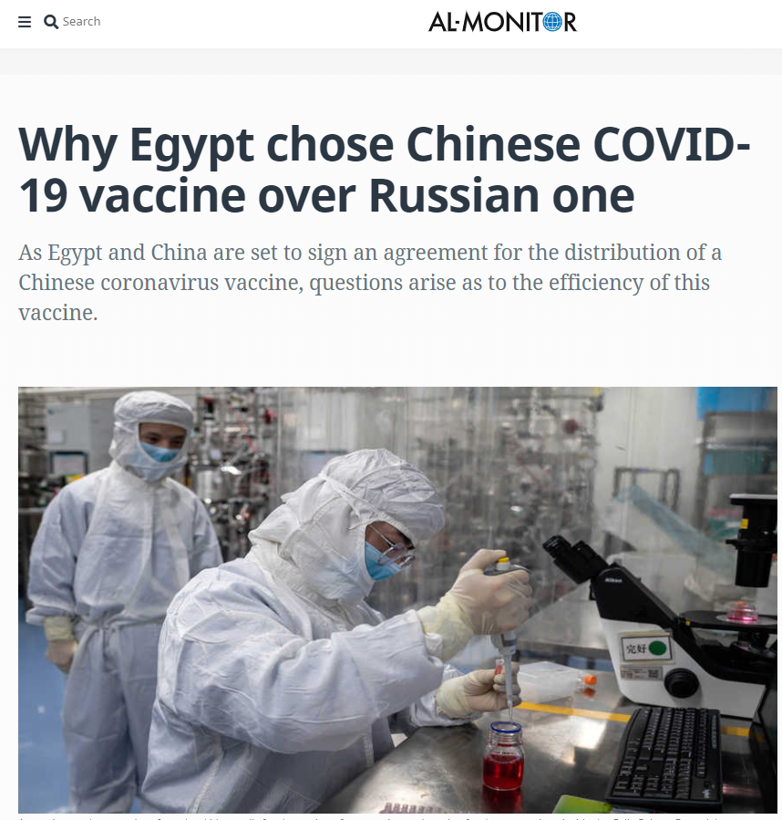 نشر موقع المونيتور تقريرًا حول أسباب تفضيل مصر للقاح الصيني لعلاج فيروس كورونا المستجد عن اللقاح الروسي.