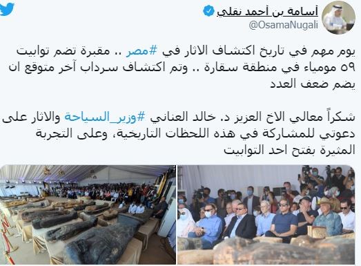 ومن جانبه وجه سفير المملكة العربية السعودية، الشكر لدعوته لحضور الإعلان عن هذا الكشف العظيم وعلى المشاركة في هذه اللحظات التاريخية ومشاهدة التجربة المثيرة لفتح أحد التوابيت، واصفًا اليوم بالهام بالنسبة للاكتشافات الأثرية.