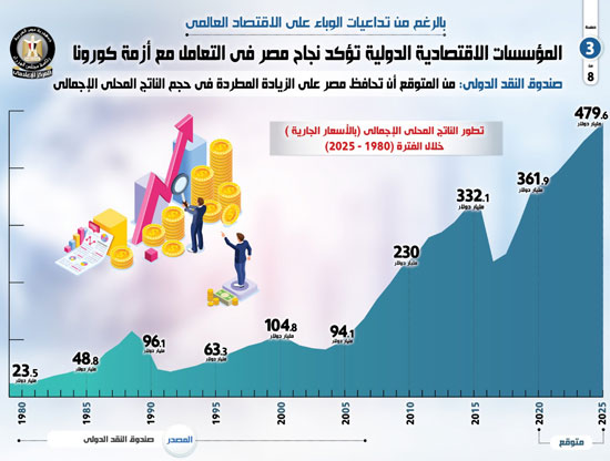 ووفقًا لصندوق النقد أيضًا، فإنه من المتوقع أن تحافظ مصر على الزيادة المطردة فى حجم الناتج المحلى الإجمالي، ليسجل 479.6 مليار دولار خلال عام 2025، مقارنةً بـ 361.9 مليار دولار في عام 2020، و332.1 مليار دولار عام 2015، و230 مليار دولار عام 2010، و94.1 مليار دولار عام 2005، و104.8 مليار دولار عام 2000، و63.3 مليار دولار عام 1995، و96.1 مليار دولار عام 1990، و48.8 مليار دولار عام 1985، وأخيرًا 23.5 مليار دولار عام 1980.