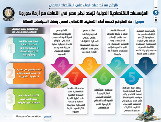 وفى هذا الصدد، أصدر المركز الإعلامي لمجلس الوزراء، تقريرًا شمل إنفوجرافات سلط من خلالها الضوء على بعض النماذج لشهادات المؤسسات الاقتصادية الدولية بشأن نجاح مصر في التعامل مع أزمة كورونا، وتوقعاتها الإيجابية بتحسن عدد من المؤشرات الاقتصادية.