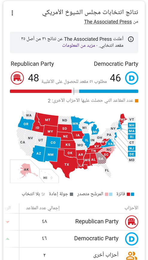 ووفقاً لوكالة الأنباء الأمريكية أسوشيتيد برس فإن الجمهوريين يسيطرون على 48 مقعد مقابل 46 للديمقراطيين و2 أحزاب أخرى حتى الآن.