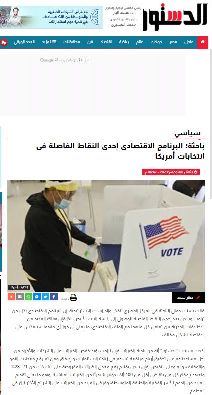 الدستور | “باحثة: البرنامج الاقتصادي أحد النقاط الفاصلة في انتخابات أمريكا”