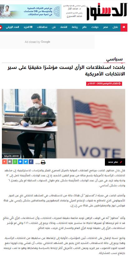 الدستور | “باحث: استطلاعات الرأى ليست مؤشرًا حقيقيًا على سير الانتخابات الأمريكية”