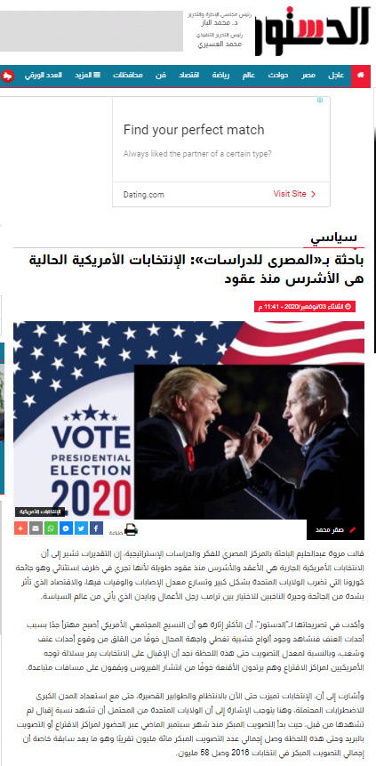 الدستور | “باحثة بـ«المصرى للدراسات»: الإنتخابات الأمريكية الحالية هى الأشرس منذ عقود”